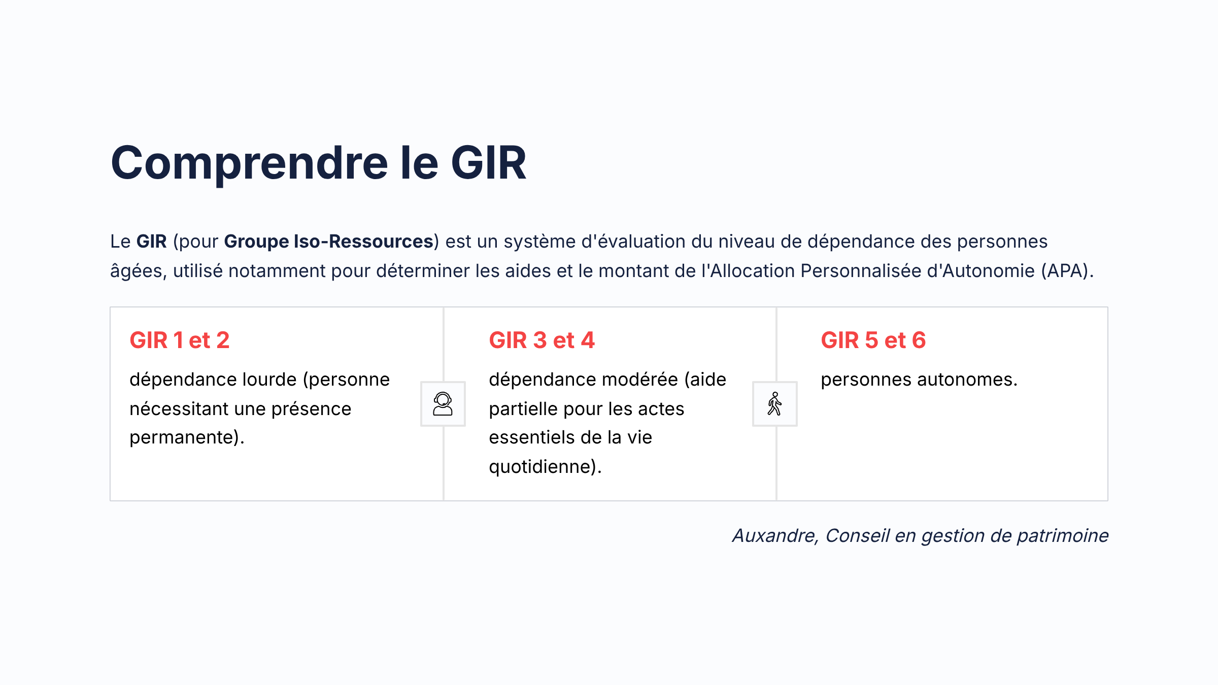 L’admission en EHPAD est encadrée et vise un public spécifique, contrairement à la Résidence Autonomie qui s’adresse à des seniors autonomes. Les EHPAD sont destinés aux personnes âgées de 60 ans ou plus qui sont confrontées à une perte d’autonomie avérée, physique et/ou psychique. Cette perte d’autonomie est mesurée par la grille AGGIR (Autonomie Gérontologie Groupes Iso-Ressources), qui attribue un GIR allant de 1 (dépendance totale) à 6 (autonomie complète).
