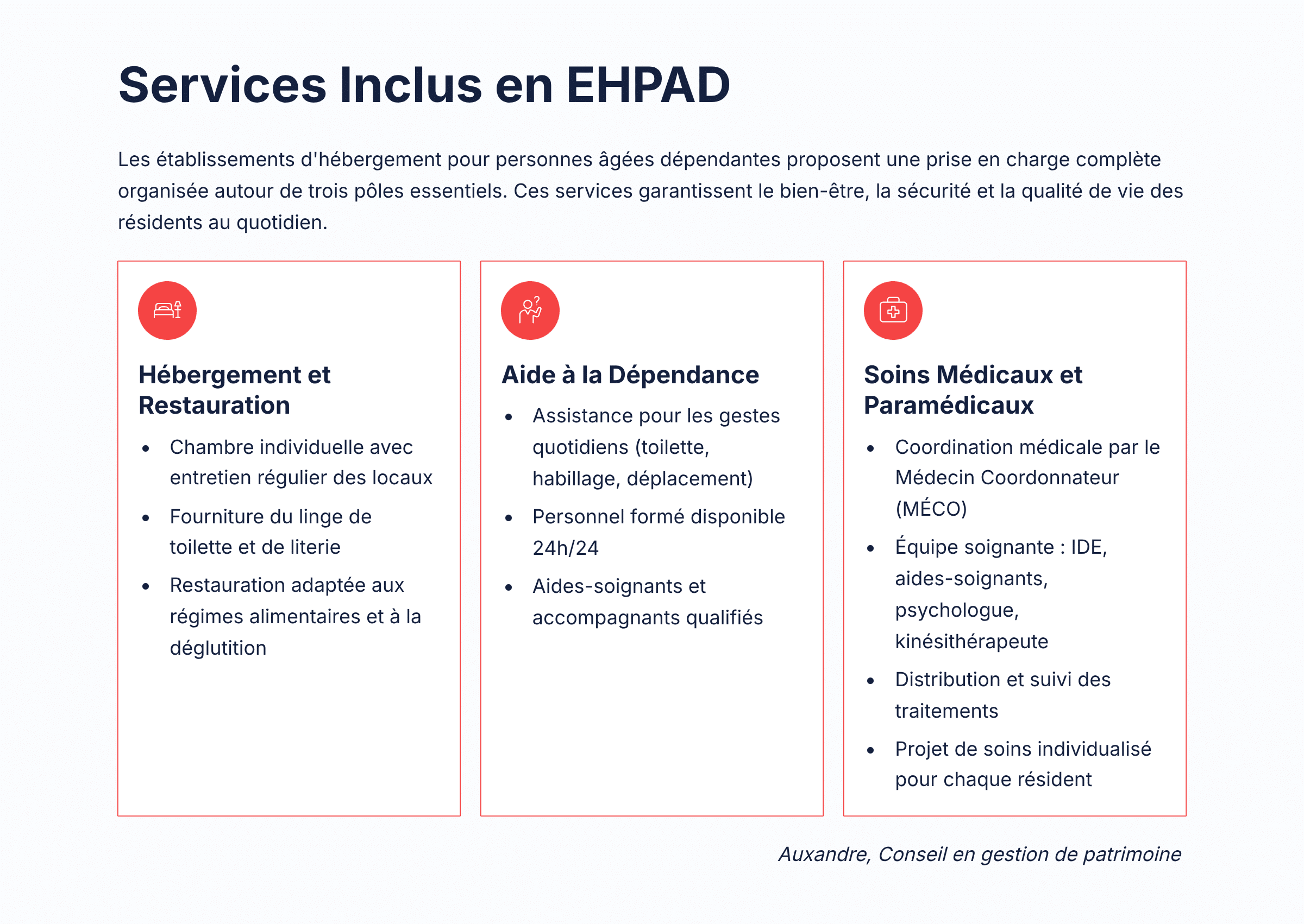 Le statut médico-social de l’EHPAD oblige l’établissement à proposer un socle de prestations fixes et complètes, au-delà du simple gîte et du couvert. Ces services, inclus dans le tarif global de l’EHPAD, se divisent en trois pôles principaux :