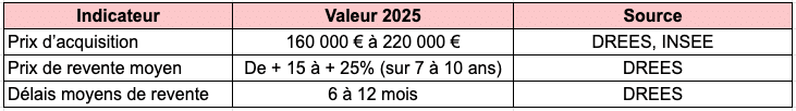 Tableau récapitulatif des prix d’achat et de revente moyens et délais en 2025